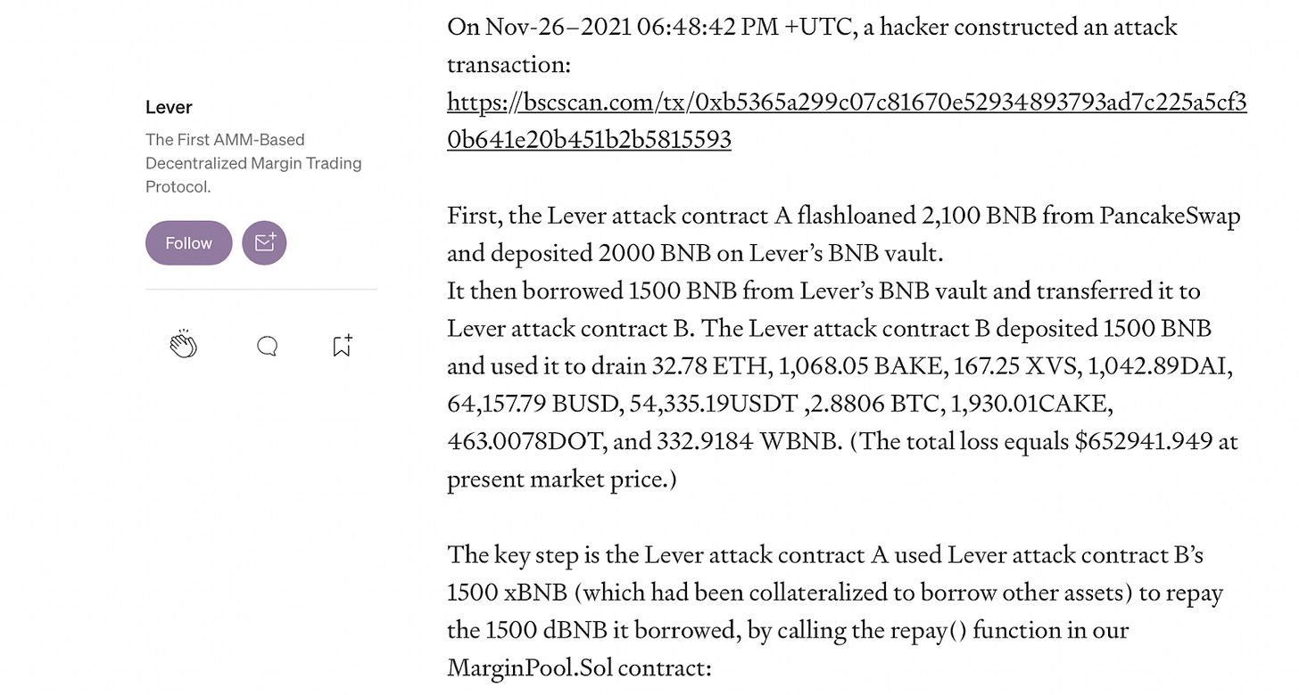Lever, a margin trading platform, became another victim of flash loans. According to the official report, the Lever protocol smart contract was attacked with 2,100 BNB from PancakeSwap and deposited 2,000 BNB in the Lever BNB vault. Lost tokens include ETH, BAKE, DOT, DAI, XVS, USDT, BTC, WBNB. The total loss is above $652K.