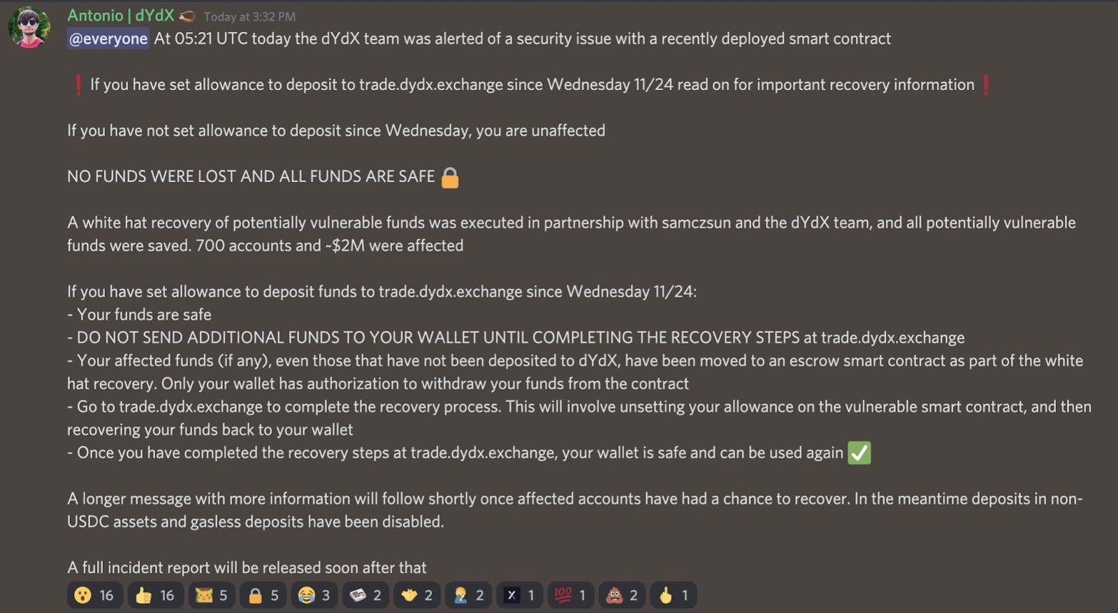 The critical vulnerability was reported by white-hat hacker Samcuzn to the dYdX team. No funds were lost in the event. The affected funds of 700 accounts ($2 Million) were diverted to an escrow smart contract for the recovery process.